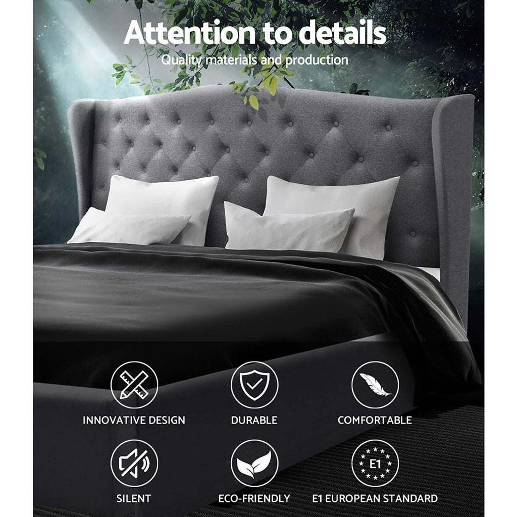 The iconic European wing headboard reflects prestigious grandeur while the tufted design complements its overall image. Padded with high density foam and upholstered in breathable non-woven linen fabric, the Pier Bed Frame is comfortable to lean on and soft to the touch.
